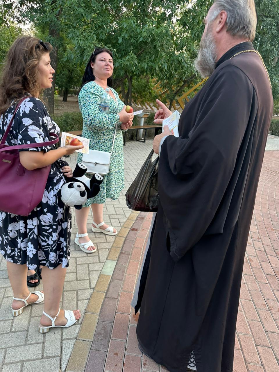 В этот же день вечером в парке Борцов революции благочинный округа протоиерей Ириней Лукьянов провел Преображенские встречи. Священник провел более 30 бесед с отдыхающими, рассказывая им о празднике Преображения, о вере, о храме, отвечал на их вопросы, вручал Преображенские буклеты и традиционное подношение этого дня – освященное яблочко.