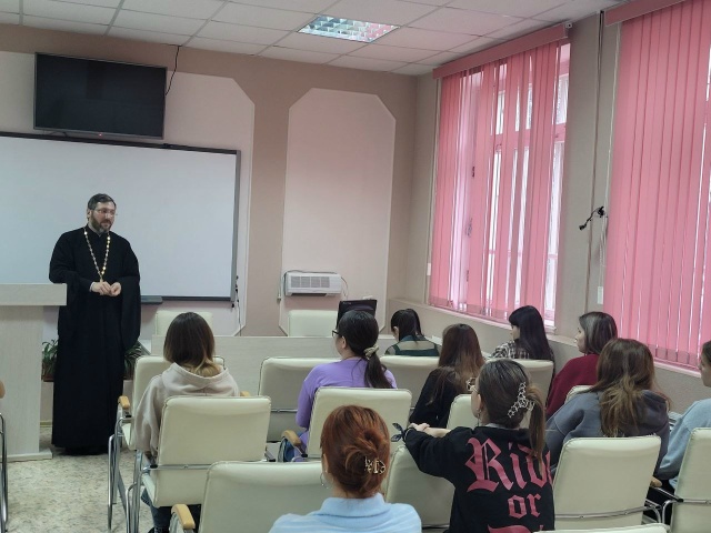 10 октября в Буденновском филиале ЧПОУ «Колледж Современная школа бизнеса» состоялась встреча студентов с настоятелем студенческого храма во имя святых равноапостольных Кирилла и Мефодия протоиереем Димитрием Морозовым.